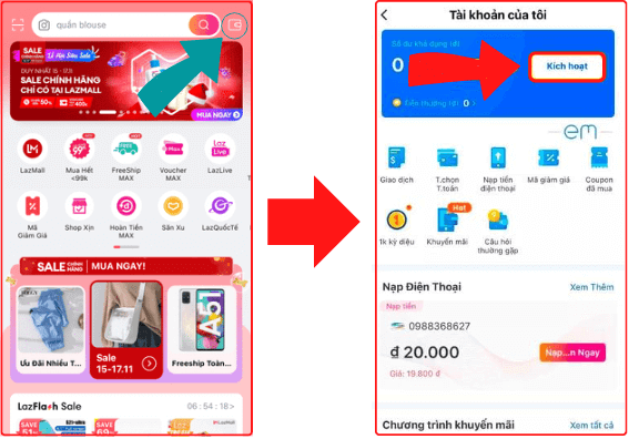 Để kích hoạt ví bạn hãy mở ứng dụng Lazada trên thiết bị di động của mình lên. Tại trang chủ của Lazada bạn hãy nhấn chọn vào phần biểu tượng của ví (nằm ở góc phải, trên cùng của màn hình). Hệ thống sẽ tự động chuyển bạn đến trang của ví eM. Tại trang chủ của ví eM, bạn hãy nhấn chọn vào mục Kích hoạt.