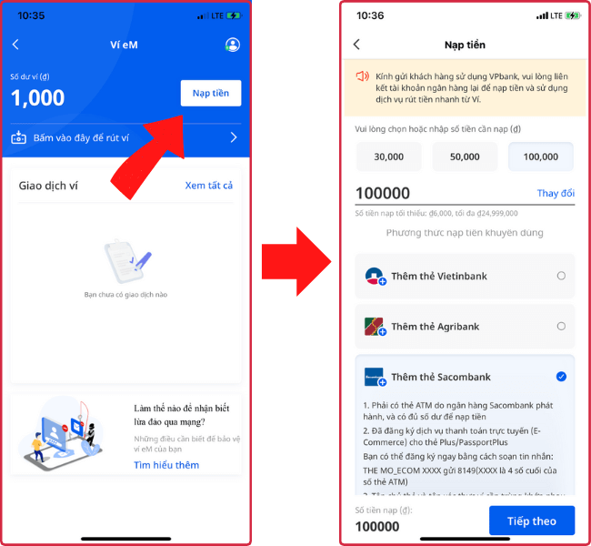 Tại trang chủ của ví eM bạn hãy nhấn chọn vào mục Nạp tiền. Hệ thống sẽ đưa bạn đến giao diện nạp tiền của ví eM. Tại đây bạn hãy nhập số tiền mà bạn đang muốn nạp vào, tiếp theo bạn kéo xuống ở phần Phương thức nạp tiền bạn chọn ngân hàng mà bạn đang muốn sử dụng để nạp vào ví. Chọn xong rồi thì bạn nhấn vào mục Tiếp theo.