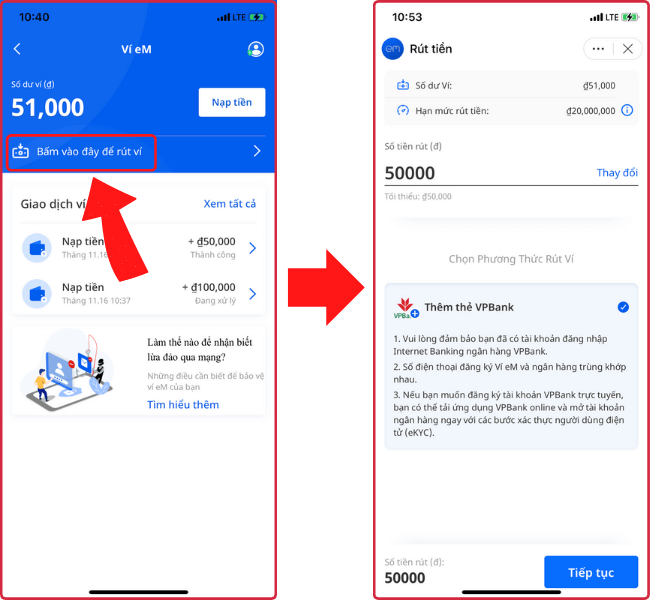 Nếu như bạn sử dụng ngân hàng VPBank thì bạn thực hiện rút tiền như sau: Tại trang chủ của ví, bạn hãy nhấn vào mục Bấm vào đây để rút ví. Sau đó chọn số tiền cần rút, chọn xong bạn nhấn vào Tiếp tục. Bạn điền đầy đủ thông tin mà hệ thống yêu cầu và xác nhận là xong.